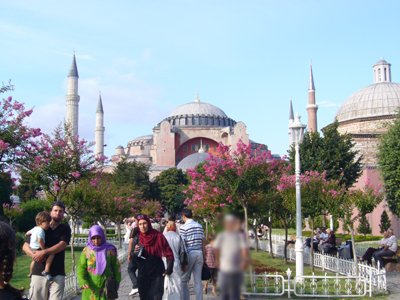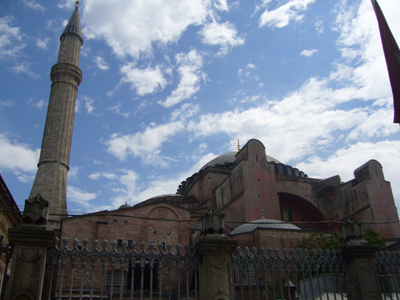 ビサンチン時代にキリスト教会堂として建てられましたが、2度の火災に合い、さらにイスタンブールを征服したメフメット2世の命によりモスクに改修されてしまいます。その後 トルコ独立の際、トルコ建国の父アタテュルクは、ここを無宗教の博物館としました。この数奇な運命は、イスタンブールの歴史そのもの・・・という感じですね。 (この写真は、1日目に撮ったものです。) ミナレットの形が異なるのは、建てたのが違うスルタンだったから、だそうです。このうち2本が、メフメット2世が建てたものです。