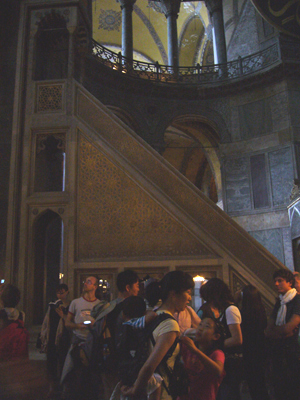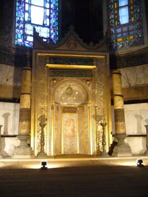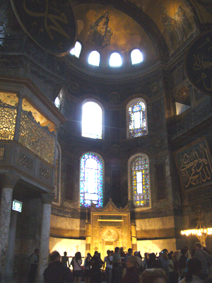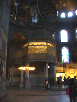 正面(後陣)をナナメからみたところ。半円の天井には 聖母子像 が。両脇のアラビア文字の書かれた円盤は、右がアラーの神、左が預言者マホメットをあらわしているそうです。そして、写真の下正面にあるのはミフラブ。ブルーモスクにもありましたが、メッカの方向を示しています。聖堂の向きは真東、そしてメッカの方向は南東なので、ミフラブは正面方向からややズレた方向に設置されています。左側のバルコニーのように見える部屋は、スルタンのためのもの。