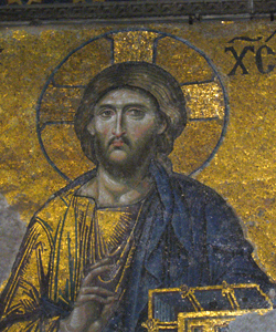 続いては、モザイクの紹介です・・・。これは、私が最も美しいと思ったモザイク、 ディーシス(請願図) 。13世紀後半か、14世紀前半の作品だそうです。場所は南ギャラリー中央格間。 キリストの頬の微妙な色合いと凛とした表情など、あまりの美しさにため息がでます。クリスチャンならずとも、思わず手を合わせたくなるような・・・本当に素晴らしいモザイクです。残念ながら破損がひどいですが。