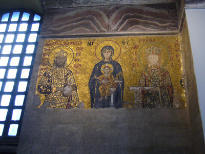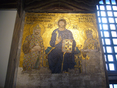 これは、南ギャラリー奥にある 全能のキリスト、皇后ゾエ、コンスタンティヌスIXモノマコス 。11世紀中期〜12世紀初期の作品。皇女ゾエ(1028-50)は、ロマヌスIII世(1028-34)、ミハイルIV世(1034-41)、コンスタンチンIX世モノマコス(1042-55) の、3人の皇帝を夫としたそうです。そして、このモザイクも数奇な運命をたどっています・・・。ミハイルIV世に変わったときには、夫婦共に顔が描き換えられ、その後、つかの間の皇帝となった、ミハイルV世は、敵であったミハイルIV世とゾエの顔をつぶします。その後復元されたときには、二人の顔とともに、キリストのモザイクも描きなおしたのだそうです。そして最後に、モノマコスと結婚した際には、夫の顔が描き変えられたのだとか 。やけにゾエだけは若いってのが笑えます。