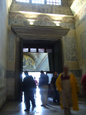 さあ、紹介が長くなりましたが、いよいよアヤソフィアの中へ。最初に迎えてくれたのは、内拝廊の皇帝の門の上にある、このモザイク。 キリストと賢帝レオVI世 です。これは9世紀後期のものらしいです。本には・・・手足の格好や体つき、顔の出来が悪いと酷評されています。しかし、このモザイク、下から眺めたときに美しくみえるように、テッセラ(金箔のガラスキューブ)が30度傾けて埋め込んであるそうです。