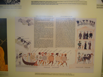 (その1) から続いています・・・ 続いては、 トロイからの出土品 コーナー。第I市から第IX市まで、世代ごとに発掘品が展示されていました。そして、それらの前に、当然ながら、トロイア戦争の解説が展示されています。それが下の写真。中身は、おなじみのものなので、かわいいイラストのほうをアップで紹介します。ただし、映画に出てこない神々のアップは省略(笑)