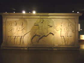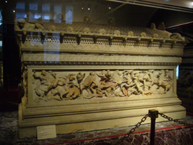 考古学博物館は、私のわがままで相当長居しました。途中でいったん昼食をとりに外へ。(本当はだめらしいですが・・・)出るときには、係員さんに、半券をもう一度みせれば入れる、って言われたのに、入るときには駄目といわれ。・・・困っていたら、再びタダで券をくれました!・・・そっちのほうが問題のような気もしたのですが、まあ入れたのでよしとしました♪ 一つ、すごくあとで後悔したのは・・・やはり同じ敷地内にあったオリエント博物館に行かなかったこと!!ここに・・・あの“イシュタルの竜”が展示されていたんですよ!!!!!!“魔人”の浮き彫りも・・・・・・。ペルガモン博物館で見てきたからいいじゃない・・・と、自分を慰めていますが、やっぱり悔しい・・・!