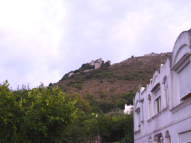 最後は、バルバロッサ(=赤ひげ)城(Castello Barbarossa)。山の上に見えるのがそうです。これは、12世紀に作られたものだそうで、アルジェリアの海賊が1535年、14ヶ月の攻撃の末に陥落させたのですが、粘り強く応戦した島民に敬意を表して残したのだそうです。この近くに、WWFパークという自然公園があるそうです。この城近辺もヴィラ・サン・ミケーレの一部としての位置づけのようです。位置的には、この左下あたりに、ヴィラ・サン・ミケーレがあります。