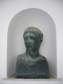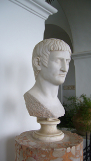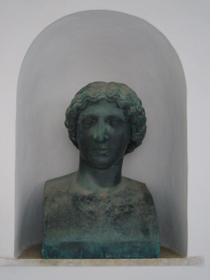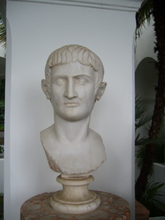 ↓左の写真は、プリマポルタのアウグストゥスのコピー。でも・・・現地の本には、“古代ローマ時代の遺構”とか紹介されてる・・・そりゃまずいでしょう、と思うのですが・・・。ともかく、この像は、このホテルのシンボルですね。カプリから坂道をあがっていくと、この像が眼に飛び込んでくるのです。