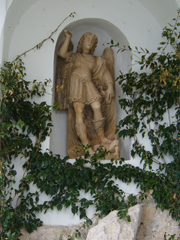 ↓左は大天使ミカエルの礼拝堂近くの聖ミケーレの木像。(ミケーレとミカエルって、同じじゃないんですかねえ・・・どうも、キリスト教聖人などのお名前はよくわかりません・・・)