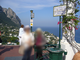 ☆ ウンベルト1世広場/小広場 (Piazza Unberto: La Piazzetta di Capri) ☆ カプリの街の、そしてカプリ島の中心ともいうべき広場でしょう。ピアツェッタの名で世界中に知られ、今も各国の著名人が集まる“サロン”だそうです!とにかくにぎわっています。アナカプリのちょっとひなびた雰囲気とは大違い!この界隈は、カプリでも一番栄えているところで、ここからブランドショップの並ぶ通りや、カプリ一のスーパーデラックス(笑)五つ星ホテルに通じる道などがあります。治安もいいので、ブランド品を買いあさりたい方々にも安心、安全な街です・・・。ちなみに、私たちには全く縁がありませんでした。(私は・・・ちょっとぐらいみたかったけど・・・夫のほうが全く興味がないので・・・)