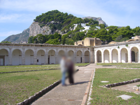ナポリ公国女王、アンジュー家ジョヴァンナ1世の側近ジャコモ・アルクッチ・カプリ伯爵(Giacomo Arucucci)が、海に面した南向きの斜面にある、ティベリウスの6番目の別荘跡地とされる場所を発見し、ここに修道院を建てることを提唱したそうです。そして1371〜1374年にかけてサンジャコモ修道院が設立されました。修道院は度重なる襲撃を受けましたが、1563年に海賊の襲撃に備えてカルトゥジオ会の修道士が新たに砦となる塔を建てて、以降1636年まで断続的に補強、拡張されました。1691年には大回廊や鐘楼などが修復され、修道僧たちの勤めが再開されました。その後はフランス軍の兵舎になったり、刑務所、療養所、病院などとして使用されたりしています。