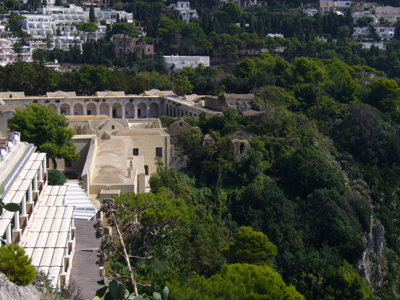 別名?カルトゥージア修道院とも呼ばれているようです。ここも、ティベリウスの別荘の跡地らしいので、何か遺跡が見られるのかと期待していったのですが・・・残念ながら、そういうものが残っていると思しき場所にはたどり着けませんでした。修復などが行われているせいなのか・・・見学できない部分もありましたし。しかし、アウグスト庭園(後でご紹介します)からみると、修道院の大回廊の横に遺跡らしいものが見えています・・・。下写真中央部付近がそれ。修道院内の教会や鐘楼は、写真の左側なのですが・・・興味の対象が遺跡だったため、写真を撮るのをころっと忘れてました(笑)。旅行記書こうというのに、まだまだ修行がたりません〜!