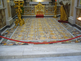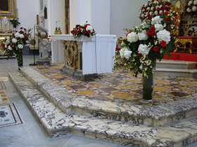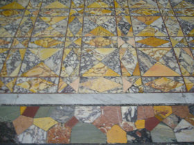 建築学的にもいろいろ魅力あるもののようですが・・・そんなところに私の興味はございません(笑)! 私的一番の見所は・・・なんといっても、主祭壇の大理石の象嵌細工の床!・・・これは、ヴィラ・ヨヴィスの『トリクリニウム』(横臥食卓のある食堂)の床が移されて来たものなんです!!ご覧ください、この美しい床を!(・・・って、分かりにくいですかねえ。)こんな素晴らしい床が、あのヴィラ・ヨヴィスに敷かれていたんですよ〜・・・やっぱり、とても素敵なヴィラだったんでしょうねえ。