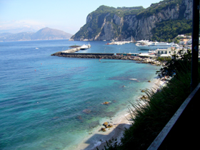 前半の最後は・・・教会から港に戻る帰り道でマリーナグランデ方面を撮った写真。海の色が美しいです。遠くにソレント半島も見えます。手前の浜みたいに見えるのは、一応海水浴場。肌を焼いているひともちらほら見えました。(でも、こちらは島の北側なので、日焼けには向かないような・・・)。ただし、砂浜、というよりは白い小石の浜なので・・・裸足だとちょっと痛そう!