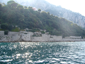 海の離宮は、アウグストゥスの滞在した(そして一説には、最も愛した)ヴィラのようですが、ティベリウスが改造・増築の手を加えたものと推定されるそうです。オーストリア人のハドワラ(=他でも略奪を行っている)によって発掘されたのですが、その彼によって床や柱頭、大理石の板などが奪われてしまったそうです。さらに19世紀初期に訓練場にされたり、小要塞が増築されたり、フランス軍に占領されたりして、ともかく・・・大きな被害を被ったそうです。現在は、サッカー場も出来てしまっています。 この遺跡はまだ深く研究されておらず、建物の全体を判断するのは困難ですが、概略から分析すれば、建築の壮大な規模、そして水道の壮大なシステムがあったとわかるようです。 ポンペイの考古学者・マイウーリ(A.Maiuri)は、離宮内の居住部が要塞の建てられた場所にあることや、そこに存在していた水槽やモザイクの床などを確認したようです。さらにサッカー場の位置には庭園などがあったと考えられ、現在は植物に覆われてしまった大理石の階段が、ニンフェウムのあった離宮の海に面した部分につながっていたそうです。さらにさらに!養魚のために使われたと思われる水槽と離宮の船着場の構造も見られ、水面下にも、養魚のための施設や他の建物が見られるそうです!!う〜近寄ってみてみたかった・・・!