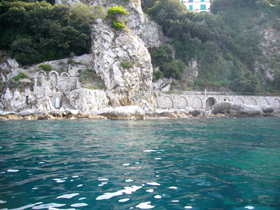 以上で、カプリ島1周ツアー終了。たっぷり2時間。南側でちょっと波が高かったりもしましたが、総じて快適なクルーズでした。気候も、暑すぎも寒くもなく。 島の周囲には、青の洞窟のほかにも、○○の洞窟、と名のついたものが山ほどあります。次回は、そんな洞窟にも立ち寄ってみたいなあ・・・・・・。