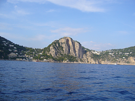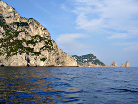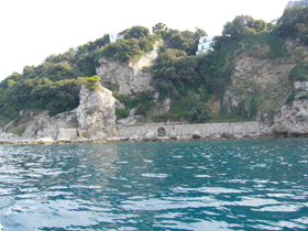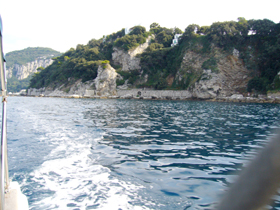 実はこのときはあまり意識していなかった(ので、近づいて写真も撮らなかったのですが・・・この左の写真の左端のあたりが、 セイレーンの岩場(Scoglio delle Sirene) 。そう、あの『オデュッセイア』に登場する場所です!!セイレーンの歌を聞くと、航行中の人々は惑わされ難破、遭難してしまいますが、オデュッセウスは難を逃れます。・・・ローレライにも通じるエピソードですね。しかし、オデュッセウスの航路が、こんな風光明媚なところだったなんて・・・あらためて、塩野さんの(元?夫君の)、『オデュッセイアは、恐妻型亭主の、壮大な嘘の物語』という説は、説得力があるなあ、と、感じます(笑)