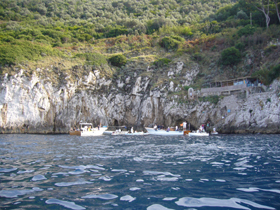 カプリ島の北側・マリーナグランデのフェリーや高速船の船着場の隣の小さな桟橋(といえるのかもビミョ〜)から、係の人が同乗して、少し沖合いまで出てくれます。そして、操縦法を習い、係の人はお迎えのモーターボートで戻ってゆき、いざ出発!! 一般的には、島を反時計回りに周遊するようです。この日は天気はよかったものの、南風が少々強かったせいか、島の南 側が波が高いので、「危ないと思ったらUターンして戻っておいで」ですと!!