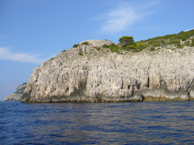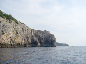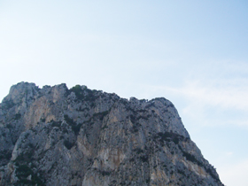 そして針路を北に。ここから島の東岸を走ります。そしてたどりつくのが・・・ ヴィラ・ヨヴィス 。下からだと見えませんし、正確にどのあたりか、ってのもイマイチよくわかりませんが・・多分、この辺(笑)。左の写真だと稜線の真ん中あたり。右の写真だと左端あたりかな・・・。立派な建物がそびえていた頃は・・・下からもよく見えたでしょうね。今となっては、どのへんが“ティベリウスの落下台”なのかもよくわからず。