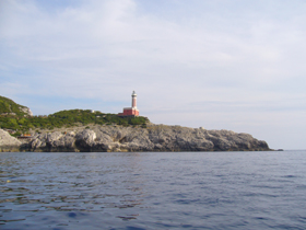 そして、西側海岸線の最南端、 カレーナ岬(Punta Carena)の灯台 です。カレーナって、舟の竜骨、って意 味なんですって!!形が似ているから、その名がついた そうです。 |