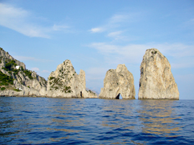 そして・・・いよいよ、ファラリョーニが近づいてきました・・・。 ファラリョーニ(I Faraglioni)奇岩 は、海の深淵から天空を突くような巨大な岩で、カプリの象徴的な光景なのだそうです。海水による侵食で、岩肌が崩れて岸壁から切り離され、続いて穴や洞窟が出来上がったとか。この3つの岩にはそれぞれ名前がついていて、左側から「地上のファラリオーネ」(高さ109m)、「真ん中のファラリオーネ」または「ステッラ(星)」(高さ80m)「外のファラリオーネ」または「スコポロ(岩)」(高さ104m)だそうです。この写真だと、高さが「ほんと?」・・・って感じなのですが、他の方角から見た写真などを確認すると、まあそうなのかな〜という感じでした。