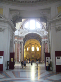 こちら↓。左の写真が、教会のメインの空間です。ここはかつての冷浴室、要するに温水プール、といったところでしょうか。壁の装飾なんかは新しいものでしょうが、柱の大きさ、天井の高さはかつての規模のはず。すごい大きさです!!通常、教会はどちらかというと、縦長の十字形なのですが、この教会はこの冷浴室の空間を生かすために横長の十字形となっています。