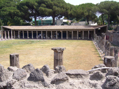 前回とは入り口が違いました。遺跡はいまだ発掘中ですから、いろいろと都合があるのかもしれません・・・・・・。この中もガイドつきツアーで回ります。見学場所は前回と大体同じ地区でした。本当は、ゼロナイの“ポンペイの少女”の最初の方に出てきた、円形競技場(少女とハインリヒが出会ったところ)にも行きたかったのですが・・・ちょうど出入り口とは反対の場所で、2時間かそこらの見学コースではとてもいけるところではなさそうです。ま、そこも、いつの日か、訪ねたいですね・・・。 ポンペイは、イタリア南部、カンパーニャ地方の都市でした。紀元前7世紀にエトルリア人がこの町の基礎を築き、やがてローマに吸収されます。ローマ時代の典型的な地方都市でしたが、紀元79年8月24日午後1時頃から始まったにヴェスヴィオ山の噴火により、街全体が6m以上の火山灰に埋もれてしまいました。そして19世紀に始まった本格的発掘により、当時の街並み、そして人々の生活ぶりを示す様々なものが良好な状態で現れました。今でもまだ、全体の1/3程度が未発掘で、発掘が続けられています。
