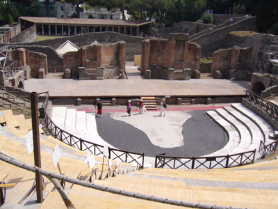 丘の斜面を観客席に利用して建造された劇場です。ギリシャの劇場の建築技法にならったものだそうです。屋根はなかったそうですが、コロッセオのように、テントを張ることができたらしいです。 隣には小劇場もあります。そちらは、音響効果などを計算して観客席の角度なども厳密に設計して作られたとか。