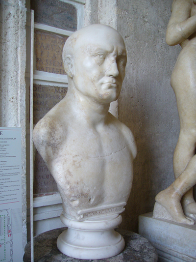 続きまして、ハゲオヤジ(笑)・・・こちら、ローマの英雄、スキピオ・アフリカヌスです。年取ったらこんな姿になっちゃったようですが、若い頃はとってもハンサムだったらしい。そして次男坊、人から愛される性格!・・・若い頃の像が残っていたら、是非見てみたかったです。塩野さんの本でも、指輪の浮き彫りの横顔しか出ていないので、きっと残っていないんだろうなあ。残念〜!!