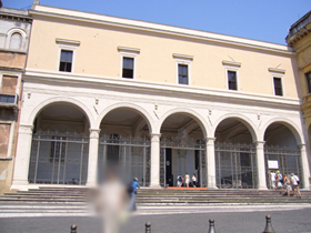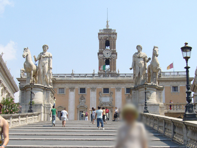 写真は、カンピドーリオの丘で、この両側(写真にほとんど写ってない・・・汗)が美術館です。向かって右側にコンセルヴァトーリ宮、左側に新宮があります。 正面の建物は市庁舎。その地下には、スッラの建設したタブラリウム(公文書館)があり、現在は左右の建物をつなぐ通路となっています。