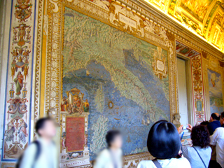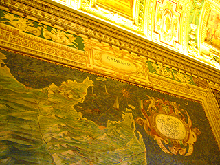 フレスコ画で、イタリアの州や、グレゴリウス13世(1572−1585年)時代の教皇領が表されています。当時の著名な地理学者、イニャツィオ・ダンティ作の下絵に基づいて1580年から1585年にかけて製作されました。各州地図には、州都の地図も書き込まれています。