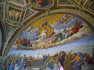とりあえず、今回ここで紹介するのは、下の2枚。左は、「署名の間」にある、『聖体の論議』。右は同じく「署名の間」の『アテネの学堂』。アテネの学堂には、背景にサン・ピエトロ大聖堂を模した古代建築を配し、古代の哲学者や思想家が、当時の人物に似せて描かれています。ラファエロの自画像もあるのですが・・・ちょっとわからないですね。ピンクの旗の下なのですが・・・。