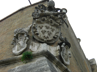 ↓右の写真は、城壁のコーナー上部に掲げられていた(多分)教皇の紋章。 記憶モードですが、歴代教皇の紋章は、楕円の下の部分に、出身家の紋章だか象徴が入っていたかと思います。たとえばバルベリーニ家の場合、ここにある百合の紋章の代わりに蜂の絵が入っていたり・・・。(誰か、ご存知の方、詳しく教えてください〜〜!) なので、同じような紋章でも、いろいろなバリエーションをみることができます。