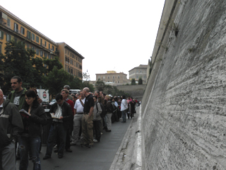 今回。・・・開館時刻の9時をちょっと回ったくらいに到着。すると、このように(↓)既に長蛇の列が城壁に沿って延々と続いています。そして、後ろにも次々と・・・。