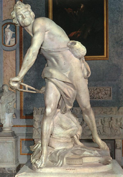 以前にTV番組でルネッサンスとバロックの美術、音楽の比較がなされていたことがあり、その際にこの像、ミケランジェロのダヴィデと比較されていました。ベルニーニ好きな私なのですが・・・実は私、ダヴィデ像は圧倒的に、ミケランジェロの作品のほうが好きなんです(爆)。(ミケランジェロの作品の実物は、まだ未見なんですけど・・・)子供の頃写真で見て、マジで惚れましたからね〜・・・。ベルニーニといえど、その強烈な印象にはかないません・・・(笑)。