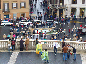 右の写真は、スペイン階段から広場を取った写真ですが、噴水の向うに、いわゆるブランドストリートである、『コンドッティ通り』が見えます。通りの入り口のの左端にパラソル?があるのがわかりますでしょうか・・・?