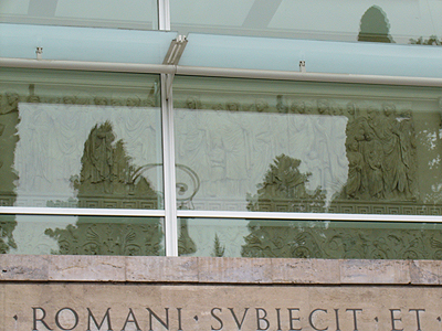 この日は休館日でしたから、外からみただけです。前回訪れた際の、中の様子はこちらで⇒。 この写真は南側壁面で、一番左の頭だけ残っているのがアウグストゥス。窓枠の右の、トーガの端っで頭を覆っているのがアグリッパ、その次の次(顔がきちんと認識できるものだけで数えてください!)がティベリウス、そのまた次の次がドゥルーススです。