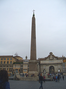 この広場は、北からのローマ巡礼者の関所のような場所だったようです。上の写真は、広場中央に立つオベリスク。これは、アウグストゥスがヘリオポリスから運ばせて、大競技場に飾られていたものらしいです。16世紀末に発掘され、シクストゥス5世により、この場所に設置されたとのこと。右に見えているのが、ポポロ門。その横には、映画『天使と悪魔』にも登場した、サンタ・マリア・デル・ポポロ教会がありますが、あいにく工事中でした・・・残念。