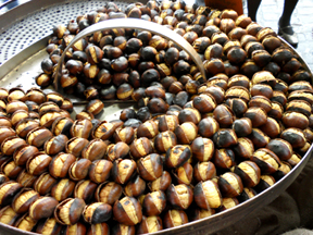 そこで売られていたのが・・・これ♪ 焼き栗で〜す!ヨーロッパの秋冬の風物詩、ですかね〜・・・。一包み買って皆で食べました。ホクホクして美味しかった♪