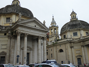 | こちらは、双子教会と呼ばれる二つの教会。広場の真ん中から見ると左右対称に見えるのですが、実際はちょっと違うみたいです。左側がサンタ・マリア・イン・モンテサント教会、右側がサンタ・マリア・デイ・ミラーコリ教会。 |