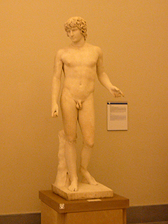 続いては、アルテミス。左は、ミューズとして修復されたアルテミス。紀元前4世紀前半の、ギリシャのオリジナルを1世紀にコピーしたものだそうです。 アルテミスといえば・・・弓矢とか、月とか、トゥニカとか、それと分かるスタイルがあると思っていたのですが・・・これ、何の特徴もないですよね〜。ま、美しいですが・・・。 一方右は・・・確か、そこそこ有名だったとおもうんだけどなあ・・・ラベル撮り忘れてました(泣)。乳房がたくさんあるのが特徴です。普通(ギリシャ神話的には)アルテミスは処女神ですが、このスタイルって、確か・・・他の神話の神様とかとごっちゃになったりしてて、多産とか繁栄とかいう意味合いの女神として形作られているのではなかったかと・・・記憶モードです。すいません。 ![]()