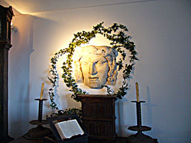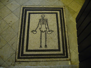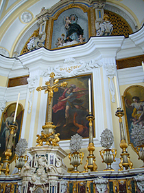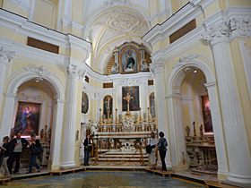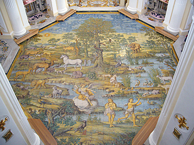 今回のカプリの旅のトップにも使ったものです。やはり絶景・・・ですよね。 ちなみにスフィンクスは、海に向いているので、見学コースから顔は見えないのです。 それはちょっと残念ですよね。 これはアウグストゥス、ティベリウス時代のヴィラの寝室(cubicolo)の遺品で、アクセル・ムンテによりこのように配置されたようです。壁にいろんな破片が埋め込まれている、というような感じですね。手前の柱も発掘品でしょうか・・・。 説明には、「ティベリウス“時代”の、と書かれているのですが、このあたりもティベリウスの12のヴィラのひとつといわれていますから、もしかしたらティベリウス本人の寝室からの発掘品かも??・・・と思ってみたりもしています。 ![]() そうですね・・・このヴィラ、確かに立派なんですけど、ちょっと入場料が高いですね(笑)。一人6ユーロです。やはり、外国であるスウェーデンの持ち物(?)だからなのでしょうか・・・。この広いところを維持するのはそれなりに大変だとはおもいますが・・・。 ☆ サン・ミケーレ教会 (Chiesa di San Michele) ☆ ![]() テレジア会修道院と共に、マドレ・セラティーナ修道女によって、1698年から1719年にかけて建設された教会です。設計者は、ナポリのアントニオ・ヴァッカーロで、縦横の長さが等しいギリシャ十字の建物に8角形の中心を持ちます。壁は綺麗に漆喰で仕上げられています。 床のマヨルカ焼きの装飾は、ソリメーナ(F.Solimena)の原画を元にして、アブルッツィオ出身のマヨルカ焼の職人であるレオナルド・キアイエーゼ(L.Chiaiese)によって製作されたものです。彼は、タイル焼きの巨匠、と、呼ばれていたそうです。絵のタイトルは、『アダムとイヴの楽園追放(La