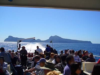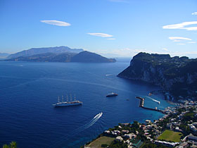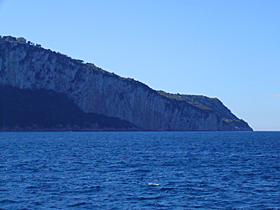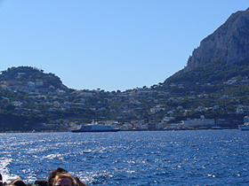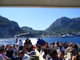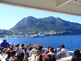 このフロアを回った後に、すごく小さな螺旋階段を上り、パイプオルガンの設置された上階に上がります。もちろん一方通行で、それでもちょっと太った人だと一苦労するほど小さな階段です(笑)! ![]() ![]() これにてカプリ島観光は終わりです。 昼ごろの高速船に乗り込み、ナポリへ・・・ ☆ カプリ島を後に (高速船) ☆ ![]() 午後2時にナポリのホテルで観光ガイドさんと待ち合わせでしたので、ちょうどお昼頃の高速船でカプリ島からナポリに移動しました。これまでに4回船に乗ったことになりますが、この時初めて!船からカプリ島の全体像をみることができました!このときは、船の2階席も立ち入り可能になっていたのです。 そのとき撮ったのが上の写真。水平線がナナメなのは船が揺れてたから(?笑)ということでご容赦ください! ![]() そしてこちらが、島の西側(こちらから見て島の右側)。アナカプリ方面ですね。残念ながら、アナカプリの町は、こちらから見ることはできません。右写真の⇒が宿泊したホテル、「チェザール・アウグストゥス」で、この後ろ側にアナカプリの町が広がっています。 ![]()