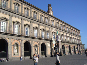 Francesco di Paola)。広場のほうは、ナポレオン統治下の1809年にナポリ王ミュラが“王宮前を市民のフォーラムにしよう”と言い出して建築が始まったのだそうですが、その後ミュラは失脚、銃殺されてしまったそうです。その後、スペイン系ブルボン王家のフェルディナンド1世が王位に復帰しましたが、広場の建設は続けられたそうです。一方、教会のほうは、フェルディナンド1世がナポレオン追放を祝うために建てた教会で、1817年着工、1846年に完成したそうです。