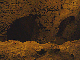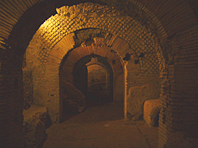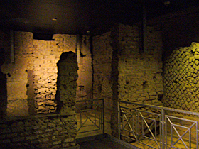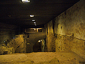 さあ。地下に入ってきました! 地下の歩く高さのさらにその下にも、このように遺跡が見られます。一番下はギリシャ時代、その上の層はローマ時代の遺跡らしいです。 ![]() このあたりは、このように目の高さより下に遺構が見られます。ちょっと詳細不明ですが・・・。やはり、「一番下はギリシャ時代」を信じると、これらはギリシャ時代のものなのかなあ??? ![]() しばらく歩いていくと、目の高さに遺跡が。このあたりは、ローマ時代の商店街だそうです。左の写真、ベンチみたいになっているところは、商品を並べるところだったとか。右の写真は、建物の明り取り、通気口・・・だったっけかな?? ![]()