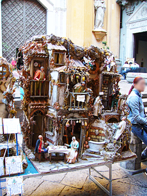 ☆ プレセピオ ☆ ![]() イタリア版クリスマスツリー、といったところなのでしょうか・・・。イタリアでは、クリスマスを祝う際に、キリストの生誕を再現したドールハウスのような「プレセピオ」を作るのだそうです。 ナポリの人は、とりわけこれに愛着を持っているのだとか。 教会の横の通りには、このプレセピオの完成品や材料のお店が並んでいました。