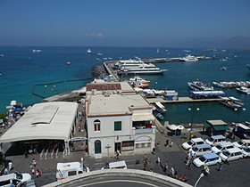 ホテルのチェックアウトは12時。 ホテルを出て、カプリ島に向かう高速船の発着するベヴェレッロ乗船所へ向かいました。歩きでもいけない距離ではありませんでしたが・・・やはりスーツケースを持っていましたので、ここはジーノさんのおすすめもあって、ちゃんとタクシーで移動しました(笑)。 今回は、なぜかちょっと行き先ごとの乗り場がわかりにくいような気がしました・・・・・・。 表示とかが悪かったのかな??? |