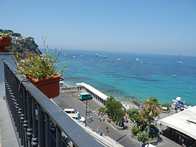 そして、こちらはホテルからの景色。左は、バス停、というか、一応ターミナル?とその向こうには小さな海水浴場。・・・ちなみに、カプリ島のビーチは、砂浜ではなく、小石なんですよね。素足で歩いたら、ちょっと痛そうな感じ。