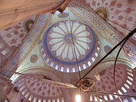 本当に,とても美しいモスク.正式名称は、 スルタンアフメットジャミィ 。この建物の中のイズニックタイルのブルーの美しさから、ブルーモスク、と呼ばれるようになったそうです。もう一つの大きな特徴は、 ミナレット と呼ばれる尖塔の数。全部で6本ありますが、これは世界中のモスクの中の最多なのだそうです。 スルタン アフメット1世が1609年に建造を命じ、オスマントルコの高名な建築家スィナンの弟子・メフメット・アーによって7年かけて建てられました。