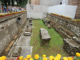 下,左の写真は入り口の古い遺跡.テオドシウス帝時代の教会跡だそうです.右は入り口の門で,「皇帝の門」です.