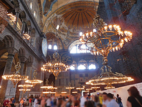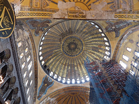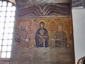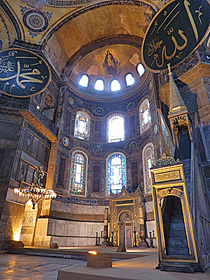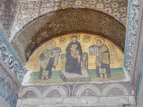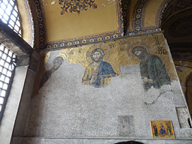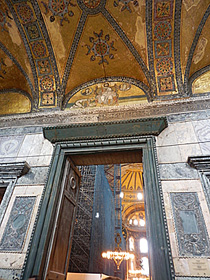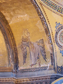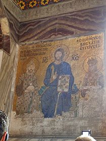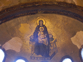 下,正面の聖母子像のモザイクです.右の写真,上のほうには聖母子像,両脇の円盤はアラーとかのイスラム教が崇拝する人物が記されてます.そして右下の階段はミンバル,その横の真正面よりちょっと右にずれたところにある祭壇のようなものはミフラブです.ミフラブは,メッカの方向を示しているので,真正面から少しずれてます.・・・まあ,このキリスト教とイスラム上の象徴の入り交ざった正面の姿が,この建物の歴史を端的に表している,ということですね.