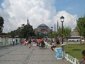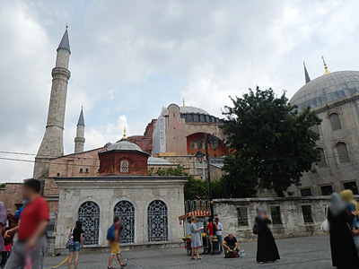 | ヒポドゥロームを抜け,ブルーモスク側の敷地からアヤソフィアをのぞみます.このころには,だいぶ青空が見えてきてますね. |
