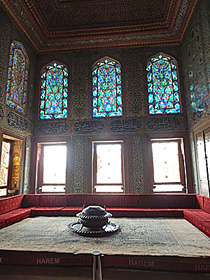 こちら,下左は皇子たちの部屋(カフェス)??・・・かどうかが不明.(写真を写した順番だとそうなるんですが・・・なんか,説明パネルのバックのタイルと,こちらのタイルの模様が異なるような・・・??????)う~ん,情けなし...でも,「ステンドグラスの窓や貴重なタイルで華麗な装飾を施した17世紀の建物」7との,ガイド本の記載があったので,やっぱりそうかな?皇子たちが隔離されていたところのようです.本来は,12の皇子たちの住まいがあり,2~3部屋で構成されるそれぞれの住まいで,各自にお付きの宦官たち,お気に入りの女官たちと過ごしていたようです.また,皇子たちが互いに接触を持つことはなかったとか.また,皇子と女官の間にできた子供の出産は許されず,堕胎させられるか,人知れず宮殿外に里子に出されてしまったそうです.